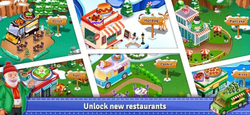 Levels in the game are designed to make you forget the world and enjoy the Christmas cooking experience. Head from one restaurant to another on this journey. You will unlock new restaurants as you go and explore the Christmas valley.